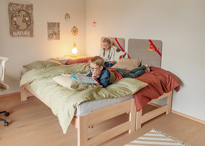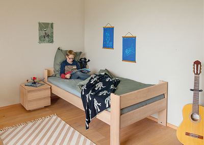 Stabile Betten aus Massivholz, die Sicherheit und Komfort bieten. Durchdachte Konstruktionen sorgen für Langlebigkeit und eine ruhige, natürliche Ausstrahlung.