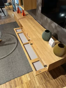Eiche, Innenholz teils Buche, natur geölt, Touchbeschläge bei Laden, Klappen u. Türen,